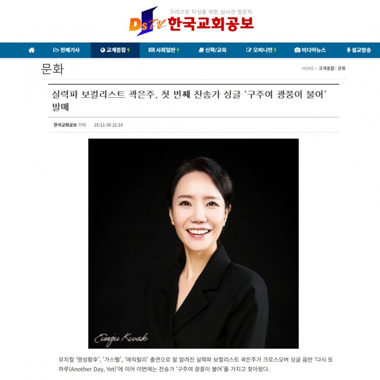 [기사] 실력파 보컬리스트 곽은주, 첫 번째 찬송가 싱글 ‘구주여 광풍이 불어’ 발매(한국교회공보)